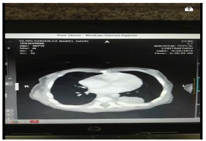 Se realizó TAC de tórax contrastado, la cual mostró a nivel del lóbulo inferior izquierdo imagen de alta densidad compatible con secuestro pulmonar (ver figura 6).
