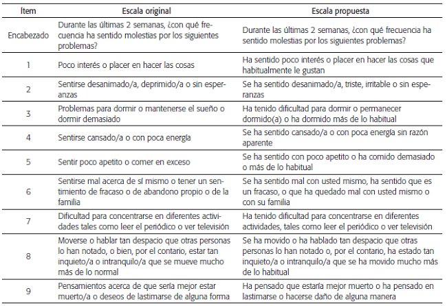 El proceso de adecuación permitió realizar algunos ajustes gramaticales en el instrumento a fin de hacerlo más comprensible en el contexto peruano; tales como: en el ítem 2 se consideró incluir la palabra “ triste” para reforzar el concepto de deprimido; en nuestro trabajo se decidió reemplazar deprimido por estar triste, puesto que el estado de ánimo triste es el indagado por la escala de tamizaje; de la misma manera, en ambas escalas, peruana y colombiana, en el ítem 9 se añadió la frase “hacerse daño”, ya que la palabra “lastimarse” no es considerada de amplio uso en su contexto para indagar sobre formas de autoagresión. En la versión peruana se recomendó no especificar la palabra “periódico” en el ítem 7; en nuestro trabajo, un experto sugirió eliminarla, sin embargo, es una actividad de uso rutinario en nuestro país.