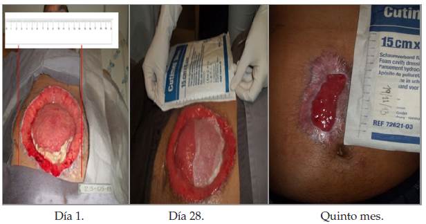 Egresó de la institución hospitalaria a los 81 días para manejo ambulatorio, con una herida abdominal abierta de 15 cm x 16 cm, 0.5 cm de profundidad, 95 % de granulación y 5 % de fibrina. Bordes irregulares macerados, poco exudado, continuidad bajo cuidado integral a nivel domiciliario, haciendo resaltar la educación, promoción de la salud, autocuidado y adherencia a hábitos saludables. Todos los tratamientos farmacológicos fueron suspendidos al egreso. Después del egreso hospitalario, el día 28 se encontró la herida con longitud de 13 cm x 10 cm, 98 % de granulación y 5 % de fibrina, bordes afrontados, con hipergranulación, lo cual incidió en la continuidad del proceso de epitelización (figura 1, día 28). Se continuó el tratamiento con productos de alta tecnología (Cutimed Siltec®) para favorecer la cicatrización y cierre de la herida reduciéndose la hipergranulación, y crema a base de óxido de zinc para protección de bordes de la herida. El seguimiento posterior mostró una herida sin exudado con diámetros de 7.5 cm x 4 cm, 93 % de epitelización, bordes afrontados poco exudado. Al quinto mes del egreso hospitalario se dio el cierre casi completo de la herida 5.5 cm x 2 cm, 100 %, de epitelización, con bordes afrontados (figura 1, quinto mes).