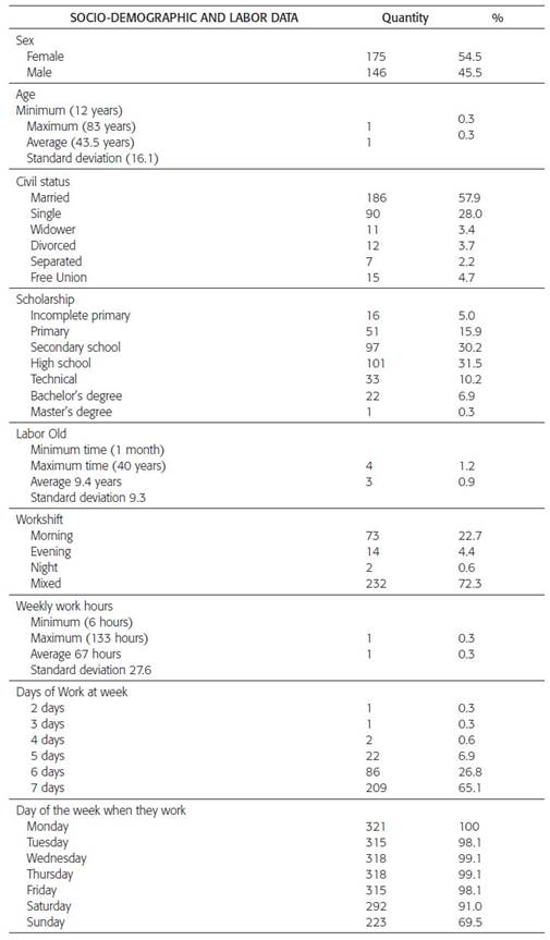 Of this total, 54.5% were men, the rest were women. The minimum age was 12 years with a maximum of 83, an average age of 43.5 years and a standard deviation of 16. Most 57.9% were married. 31.5% had high school studies, 6.9% had a bachelor's degree, and a person with a master's degree. The minimum working age was 1 month (1.2%), the maximum of 40 years (0.9%), with an average of 9.4 years of work. The most worked shift was mixed (72.3%). Weekly work hours reached up to 133 hours with a minimum of 6, and an average of 67 hours of work per week, working 65.1% on 7 days of the week and Monday being the most worked day (100%) (Table 1).