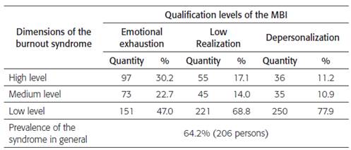 Of the 321 participants, 64.2% manifest the burnout syndrome (one or more of a burned dimension). Being placed on the medium and high level is the presence of burnout, the dimension most affected was emotional exhaustion (59.9%) followed by the Low performance at work (31.2%) and then De-personalization 22.1% (table 3).