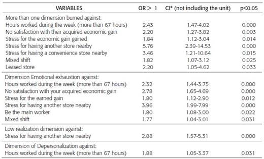 Regarding the association data (table 4), working for more than 67 hours a week, not being satisfied with their acquired economic gain, feeling stressed by that gain, having another store close, whether or not it is a convenience store, working a mixed shift and renting the store, was associated with having more than one burnout dimension. As can be seen in the same table, there are several variables that are specifically associated with the dimension of emotional exhaustion and only two with lack of realization and one with depersonalization.