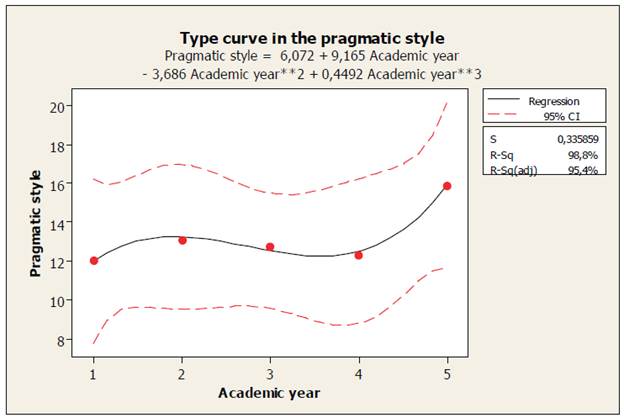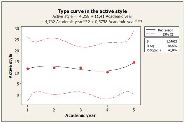 In Table 1, the results of the adjusted curve estimation (Figures 1, 2, 3 and 4) of the four learning styles studied are presented with the corresponding standard deviation of the values of y in x. The F values of the variance analysis were not significant (p> 0.05); therefore, the curves have a good fit to the model observed in each of them. In addition, the results of R2 are presented. It is observed that the styles of active, reflective and pragmatic learning are characterized by cubic curves, with minus signs in some of their coefficients, which reflects that there are moments (academic years) of decrease in the scores of these styles, and that in the fifth year, there is an increase in the respective scores (Figures 1, 2 and 4, respectively). However, the theoretical learning style shows a steady increase in each academic year. In general, the adjusted R2 values are high in all styles studied, that is, academic years "explain" the performance of observed scores relatively well, except for the pragmatic style, in which the adjusted R2 value is consistently high (91.6%).