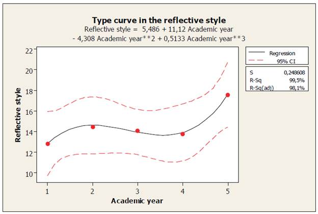 Method: A descriptive and transversal study was conducted where The Honey-Alonso learning style questionnaire was given to 535 students. The average scores observed in each course underwent regression curve type studies and the standard deviation of each average over the fitted regression curve was estimated with its corresponding confidence interval and determination coefficient.