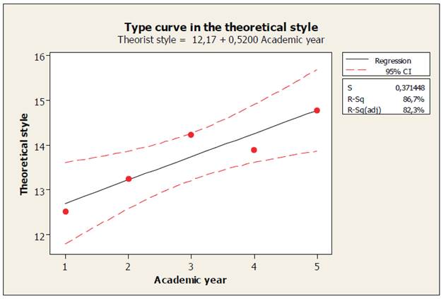 The average scores observed in each learning style was subjected to regression studies in order to determine the type of line that defines the values of each style examined. In addition to the curve type, we estimated the standard deviation (Sy.x) of each average regarding the adjusted regression curve with its corresponding confidence interval and the unadjusted and adjusted coefficient of determination (R2). The adjustment of the curve was performed by an analysis of variance (ANOVA). The level of significance used in all cases was α< 0.05. (α by definition is an Type I Error Type)