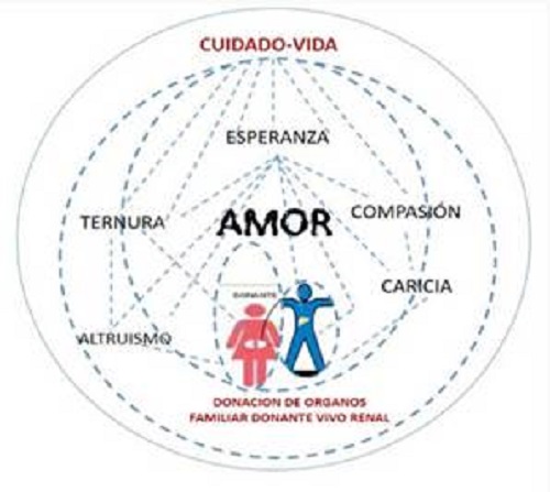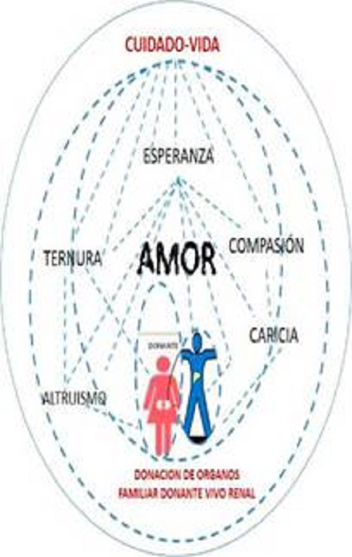Conclusions: Among the conclusions of the study, the resonance of love is the main category that emerges from the kidney donor relative in the Care-life construct, it is cemented in the care for the survival, conservation and well-being of the recipient family of organs, where the resonance of love is revealed as the great force that transforms life, unites and solidifies in conjunction with compassion, caress, tenderness, hope, resonances that humanize the care of the family, sensitize the act of organ donation.