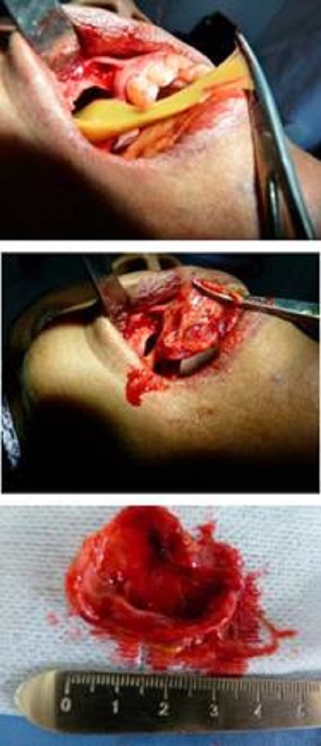 In 2014, Rivero et al reported a case of a giant residual cyst, which was the result of trauma in the lower posterior area, for which the definitive treatment was its complete enucleation. The most coherent general reasons to treat these cystic lesions are: 1) the growth of the cyst, which destroys the surrounding bone and can cause the involvement of neighboring structures, such as the nasal cavity or the maxillary sinus and cause repeated nasal obstruction or sinusitis; 2) the possibility of infection attributable to the cyst, with its corresponding complications; 3) the need to perform a histopathological study to be certain of the true nature of the lesion 7.