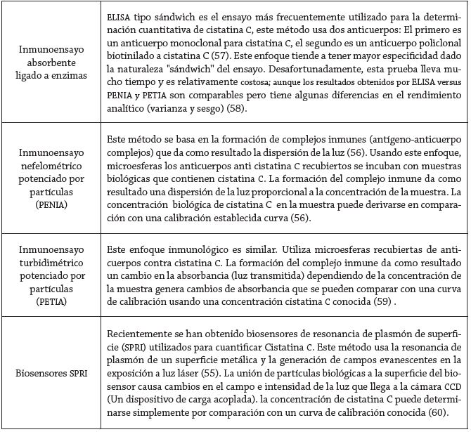 Con respecto a las técnicas de cuantificación de cistatina C, se conoce que el primer método para la determinación de este analito en fluido biológico humano se realizó por inmunodifusión radial, desarrollada por Lofberg y Grubb en 1979. Han sido reportados otros ensayos que usan una variedad de técnicas, entre las que se incluyen el radioinmunoensayo, inmunoensayo enzimático (EIA) y el ensayo inmunoensayo absorbente ligado a enzimas (Elisa) 55. Un importante avance científico condujo al desarrollo de métodos automatizados homogéneos para la determinación de cistatina C 41; estos ensayos comerciales usan tanto anticuerpos mono como policlonales de cistatina C recombinante. El inmunoensayo turbidimétrico potenciado por partículas (Petia) y el inmunoensayo turbidimétrico potenciado por partículas Penia se caracterizan por su alta precisión, sensibilidad, especificidad y rendimiento. La nefelometría detecta inmunoagregados más pequeños que la turbidimetría 56; Penia, por lo general, se considera más sensible y, como tal, se recomienda para la cuantificación de cistatina C en muestras biológicas.