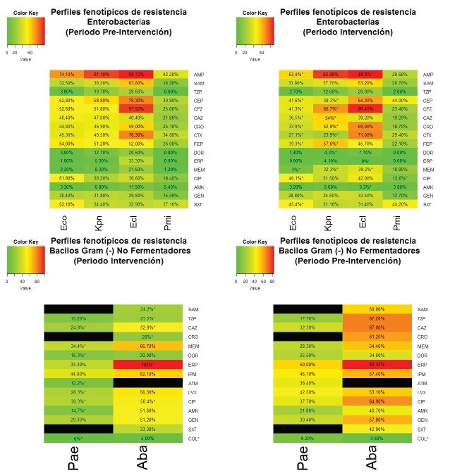 Methodology: Resistance values were analyzed for Gram-positive bacteria, Enterobacte-rial and non-fermenting Gram-negative bacteria reported in five health care institutions (IPS) of the Atlántico Department, in two periods (pre-intervention and intervention), of 12 months each between the months of June 2015 and May 2017.