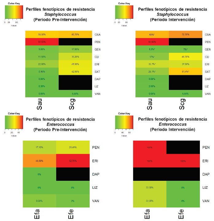 El E. faecalis no presentó resistencia para linezolid durante los dos periodos evaluados. Para el caso del glicopeptido (vancomicina), se observó una disminución de la resistencia en el periodo de intervención (8,5 a 5 %), a diferencia de penicilina y eritromicina, que presentaron un aumento moderado de la resistencia. Mientras que para E. faecium mostró elevados porcentajes de resistencia para estos dos antibióticos y se reportó una disminución en el segundo periodo para vancomicina y linezolid.
