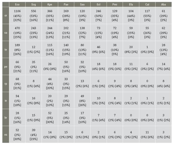 La orina fue el tipo de muestra más frecuente, con 40,3 %, y el microorganismo aislado en este tipo de muestras fue E. coli, con 12,9 % (n: 1106), seguido de Staphilococcus coagulasa negativo, 6,5 % (n: 556), y K. pneumoniae, 4,3 % (n: 366). En orden de frecuencia, las muestras de sangre ocuparon un segundo lugar, con 21,7 %, y un predominio de microorganismos similar a las muestras de orina: 5,5 % de frecuencia para E. coli (n: 470) y 2,8 % (n: 243) para Staphilococcus coagulasa negativo. En tercer lugar, en la muestra de tejidos se identificaron P. aeruginosa (1,6 %), K. pneumoniae (1,3 %) y S. aureus (0,9 %) como los microorganismos más prevalentes (tabla 1).