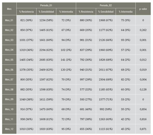Las pruebas de identificación bioquímica y susceptibilidad a los antimicrobianos fueron realizadas en los laboratorios de microbiología de cada una de las instituciones participantes. La clasificación de resistente se realizó de acuerdo con los puntos de corte establecidos por el CLSI (Clinical and Laboratory Standards Institute) 25th y 26th eds. 13. Todos los laboratorios participantes realizaron controles de calidad microbiológicos internos y externos. Los datos fueron analizados de forma global, es decir, no se discriminó la información por instituciones de salud, para preservar la confidencialidad de los datos correspondientes a los pacientes incluidos en el estudio. Se trabajó con tablas de frecuencia y gráficos correspondientes; se realizó una prueba de diferencia de proporciones para grupos independientes para hacer la comparación entre los periodos de estudio; los datos fueron analizados con R-CRAN.