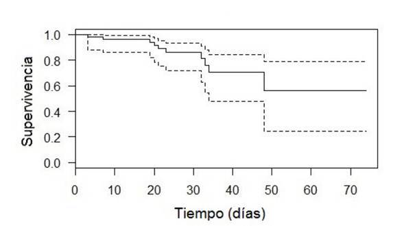 Se realizó un análisis de supervivencia mediante el método de Kaplan-Meier, el cual se observa en la figura 1. El análisis de supervivencia estableció como puntos críticos los días 21, 32 y 48. La letalidad por diagnóstico oncológico fue: mieloma múltiple (66,7 %), linfoma Burkit (50 %), leucemia linfoblástica (18,2 %), leucemia mieloide aguda (15,4 %) y linfoma no-Hodking (13,3 %).