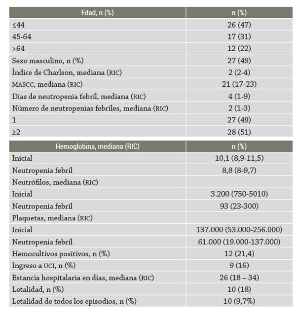 La mediana de edad fue de 48 años. El número total de episodios de neutropenia febril fue de 104 (1,89 por paciente). El 30,9 % (n=17) de los pacientes presentó algún grado de neutropenia asociada a quimioterapia previa al momento del ingreso. El 51 % (n=28) de los episodios de neutropenia febril cumplía con criterio de neutropenia profunda al momento del diagnóstico (recuento de neutrófilos <100). El 20 % (n=11) de los pacientes con NF estuvo hospitalizado durante siete o más días, de los cuales solo 2 murieron; la mortalidad de pacientes con neutropenia profunda que estuvo 7 o más días hospitalizado fue del 18 %. Las características clínicas y sociodemográficas de los pacientes se encuentran en la tabla 1.