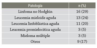 Resultados: se incluyó a 55 pacientes. La mediana de edad fue de 48 años (31-63), 27(49 %) fueron hombres. Los diagnósticos oncológicos más frecuentes fueron el linfoma no Ho-dgkin (29 %), leucemia mieloide aguda (24%) y leucemia linfoblástica aguda (20 %). La mayor letalidad se presentó en los días 21, 32 y 48. La mortalidad general fue del 9 % y la mortalidad por neutropenia profunda fue del 18 %.