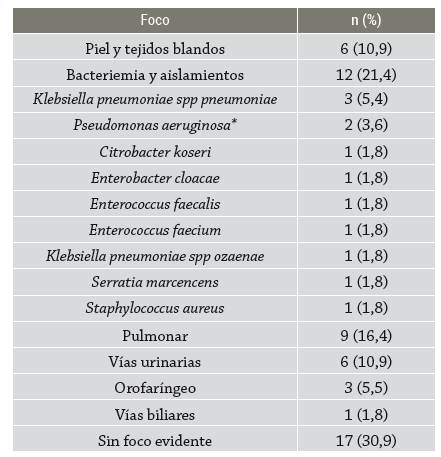 El 69 % (n=38) de los pacientes presentó un foco infeccioso, siendo los principales bacteriemia, pulmonar, vías urinarias, piel y tejidos blandos, tal como se describe en la tabla 3. A todos los pacientes se les prescribió terapia antibiótica, el 40 % (n=22) fue tratado con dos antibióticos, el 27,3 % (n=15) recibió antibiótico en monoterapia y al 32,7 % (n=18) se le indicó tres o más antibióticos. Los antibióticos de mayor prescripción fueron la piperacilina tazobactam, 60 % (n=33), vancomicina, 43,6 % (n=24), meropenem, 29 % (n=16) y amikacina, 18,2 % (n=10); adicionalmente, tres pacientes recibieron antifúngicos por coinfección fúngica con Fusarium spp y Acremonium.
