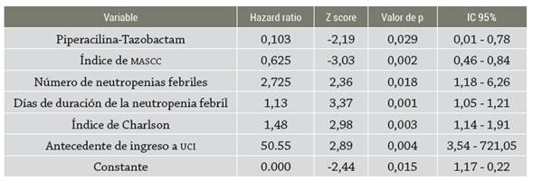 Conclusión: el número de neutropenias febriles, mayor tiempo de duración de la neutropenia febril, índice de Charlson y el antecedente de ingreso a UCI son factores de riesgo para mortalidad, mientras que el uso de piperacilina-tazobactam y el incremento en la puntuación del índice de MASCC son factores protectores.