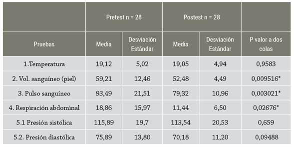 De las cinco medidas fisiológicas del estrés se encontraron diferencias estadísticamente significativas en las medidas de tres de ellas, obtenidas en el pre y postest, con un a = 0,05 en (a) volumen sanguíneo en la piel (cantidad de sangre que recorre la piel), al disminuir el promedio en el postest (X = 52,48; DS = 4,49) en comparación con el pretest (X = 59,21; DS = 12,46), (b) pulso sanguíneo (pulsación de las arterias como consecuencia de los latidos del corazón), se redujo en el postest (X = 79,32; DS = 10,96) en referencia al pretest (X = 93,49; DS = 21,51), y (c) respiración abdominal, también disminuye en el postest (X = 11,44; DS = 6.50) en relación con el pretest (X = 18,86; DS = 15.97). No se encontró cambios significativos en temperatura y presión arterial (ver tabla 1).