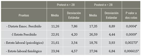 Estrés Percibido indicó que existen diferencias significativas en las medidas obtenidas en pre (X = 22,91; DS = 4,20) y postest (X = 26,59; DS = 4,44). El Cuestionario de Estrés laboral, con las siguientes subescalas: el "estrés psicológico" indicó que existen diferencias también significativas en las medidas obtenidas en el pretest (X = 21,61; DS = 3,54) y postest (X = 18,76; DS = 3,93). El "estrés fisiológico" indicó que existen diferencias igual de significativas en las medidas obtenidas en pretest (X = 23,94; DS = 4,57) y postest (X = 27,94; DS = 6,84), con un a = 0,05 (ver tabla 3).