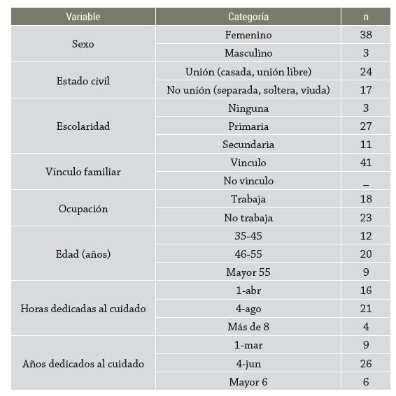 En relación cona las variables sociodemográficas, se identificó que el 93 % de los cuidadores entrevistados fueron mujeres; todos los participantes manifestaron tener un tipo de vínculo familiar principalmente como hijas(os) y esposas(os); 58,5 % tenían algún tipo de unión (casados o en unión libre); la escolaridad que predominó fue primaria (65,8 %); llama la atención que el 56 % refirió no trabajar. Las edades oscilaron entre 46 y 55 años principalmente (48,8 %), seguido de 35- 45 años. En relación con el tiempo dedicado al cuidado, se encontró que los cuidaban entre 4 y 8 horas al día (51,2 %) principalmente durante 4 y 6 años (63,4). La mayoría de los adultos mayores presentaba enfermedades crónicas tales como la hipertensión arterial, diabetes mellitus, enfermedad pulmonar obstructiva crónica, entre otras, las cuales representaba dependencia parcial para sus cuidadores. Las actividades que realizan con las personas bajo su cuidado son administración de medicamentos y/o supervisión de su uso, acompañamiento a citas médicas, preparación de los alimentos, en algunos casos ayuda para desplazamientos y vestirse (ver tabla 1).