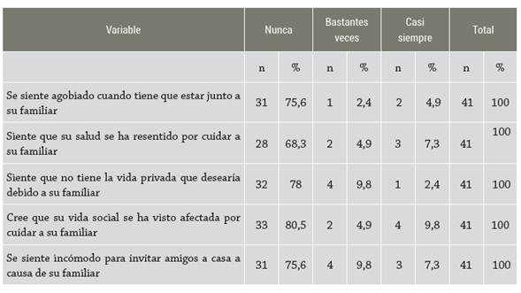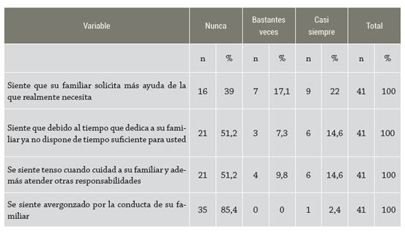En relación con la afirmación "Siente que su familiar solicita más ayuda de la que realmente necesita", el 39,1% refirió ser así "casi siempre" y "bastantes veces"; de igual manera, al indagar acerca de si "Se siente tenso cuando cuida a su familiar y además atiende otras responsabilidades", la respuesta oscilo entre las categorías nombradas con anterioridad en un 24,4 %. Las respuestas a la afirmación "Siente que debido al tiempo que dedica a su familiar ya no dispone de tiempo suficiente para usted" comparten este comportamiento en un 21,9 %.