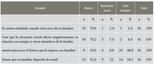 Es importante resaltar que los resultados concernientes a "se siente enfadado cuando está cerca de su familiar" y "Cree que la situación actual afecta negativamente su relación con amigos y otros miembros de la familia" se ubican en las categorías "nunca" y "casi nunca", en un 80,5 y 75,6 %, respectivamente. Es probable que la ocurrencia de este comportamiento obedezca al tiempo de dedicación diaria al cuidado.