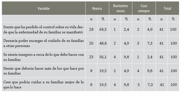 El 58,6 % de los participantes del estudio "cree que podría cuidar a su familiar mejor de lo que lo hace", mientras el 43,9 % "siente que debería hacer más de lo que hace por su familiar", el 19,6 % "siente inseguridad a cerca de lo que debe hacer con su familiar" y el 21,9 % "desearía poder encargar el cuidado de su familiar a otra persona". A pesar de estos resultados se observa que el 68,3 % de los cuidadores manifestó "no haber perdido el control sobre su vida desde que la enfermedad de su familiar se manifestó (ver tabla 6).