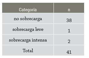 Method: Quantitative, descriptive, cross-sectional study. Sampling at convenience constituted by 41 primary caregivers of older adults to whom the scale of Zarit was applied original version, an instrument that consists of 22 items whose purpose is to quantify the degree of overload suffered by caregivers of people with partial dependence.