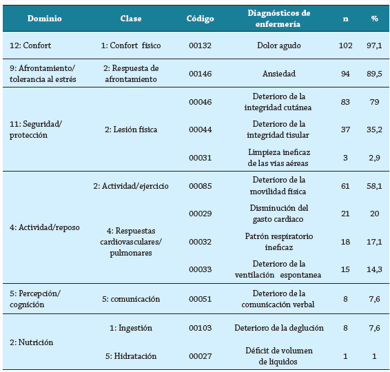 En la tabla 1 se observa que los diagnósticos de enfermería reales más frecuentes fueron "dolor agudo" (97,1 %), "ansiedad" (89,5 %), "deterioro de la integridad cutánea" (79,0 %), "deterioro de la movilidad física" (58 %), deterioro de la integridad tisular (35,2 %) y disminución del gasto cardiaco (20 %).