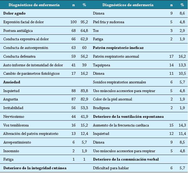 La característica definitoria expresión facial de dolor estuvo presente en el 95,2 % de pacientes que presentaron dolor agudo, la característica inquietud en el 83,8 % con ansiedad; "alteración de la integridad de la piel" en el 79,0 % con diagnostico "deterioro de la integridad cutánea"; inestabilidad postural en el 47,6 % de pacientes con diagnóstico "deterioro de la movilidad física" (tabla 2).