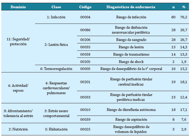 Cinco dominios resultaron afectados, especialmente el dominio 11: seguridad/protección, y el 4: actividad/reposo. Los diagnósticos de riesgo más frecuentes fueron "riesgo de infección" (76,2 %), "riesgo de sangrado" y "riesgo de disfunción neurovascular periférica" (26,7 % cada uno) (tabla 3).