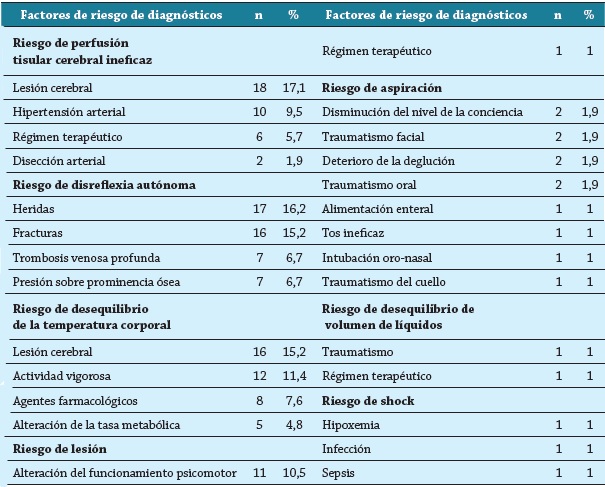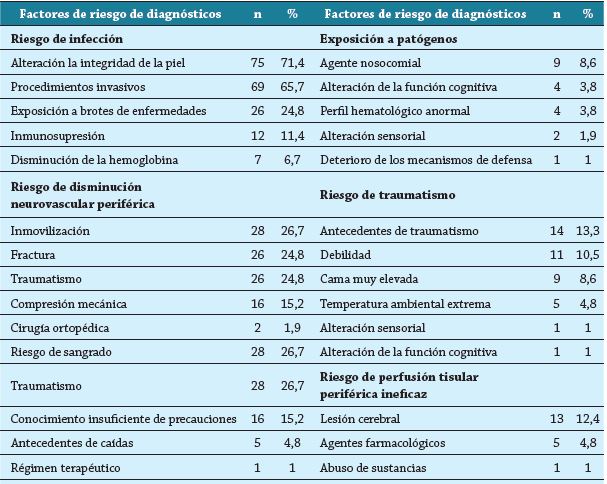 Los factores de riesgo más frecuentes fueron "alteración de la integridad de la piel" en el 71,4 % de pacientes con diagnóstico Riesgo de infección, "inmovilización" en el 26,7 % de pacientes con Riesgo de disminución neurovascular periférica, y "traumatismo" en el 26,7 % con diagnóstico "Riesgo de sangrado (tabla 4).