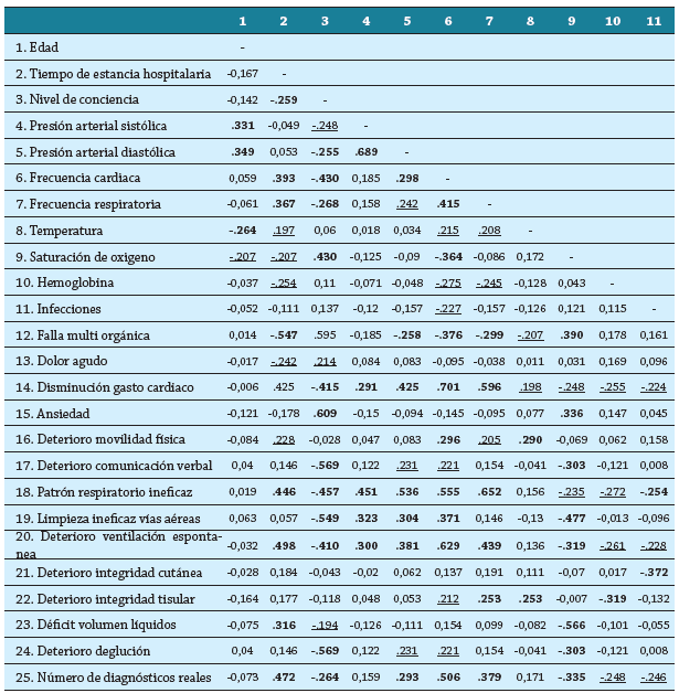 Las tablas 5 y 5.1 exponen la correlación, y se destaca que la frecuencia cardiaca fue la variable que mostró mayor fuerza de asociación positiva con el número de diagnósticos (r=0,506); la correlación fue mayor con el diagnóstico disminución del gasto cardiaco (r=0,701), deterioro de la ventilación espontánea (r=0,629) y patrón respiratorio ineficaz (r=0,555).