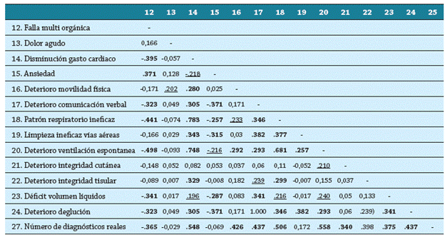 A pesar de que predominó el diagnóstico dolor agudo, este mostró asociación positiva solamente con el diagnóstico deterioro de la movilidad física (r=0,202); mientras que el diagnóstico disminución del gasto cardiaco correlacionó en forma positiva con todos los diagnósticos de enfermería identificados, siendo más fuerte y directa con los diagnósticos patrón respiratorio ineficaz (r=0,783) y deterioro de la ventilación espontanea (r=0,748).