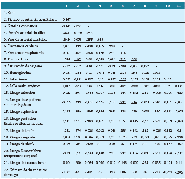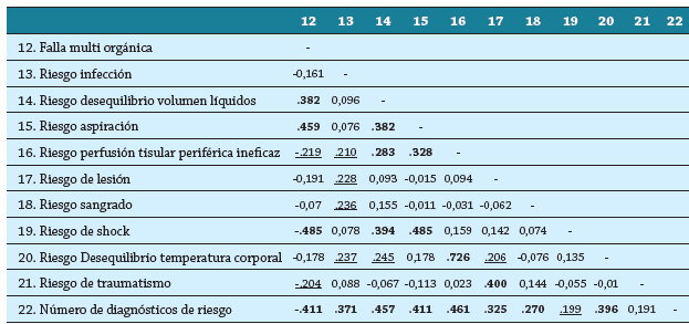 La estancia hospitalaria mostró correlación directa con siete diagnósticos de enfermería de riesgo, siendo más fuerte con el diagnóstico riesgo de shock (r=0,584).