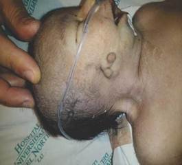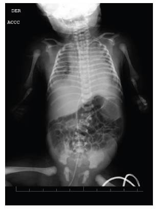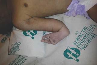 Recién nacido masculino, producto de segundo embarazo, madre de 23 años, sin exposición a teratógenos y/o a agentes mutagénicos durante la gestación. La madre cursó con diabetes gestacional manejada con dieta. El perfil infeccioso para hepatitis, VIH, sífilis, toxoplasmosis, rubeola, citomegalovirus y herpes simple fue negativo. Ecografía obstétrica a las 35 semanas reportó polihidramnios, agenesia renal izquierda, mesomelia de extremidades superiores con agenesia de radio bilateral. Parto por cesárea a las 37 semanas, observándose un neonato hipotónico, con mala adaptación neonatal, APGAR 2-3/10 y 4/20, al minuto y 5 minutos de vida, respectivamente, por lo cual se iniciaron maniobras de reanimación. Falleció posteriormente por paro cardiorrespiratorio. Las medidas antropométricas fueron: peso 3060 gr (P25, -0.66 z), talla 49 cm (P14, -1.06 z), perímetro cefálico 34 cm (P18, -0.9 z), perímetro torácico 31 cm, perímetro abdominal 28 cm.