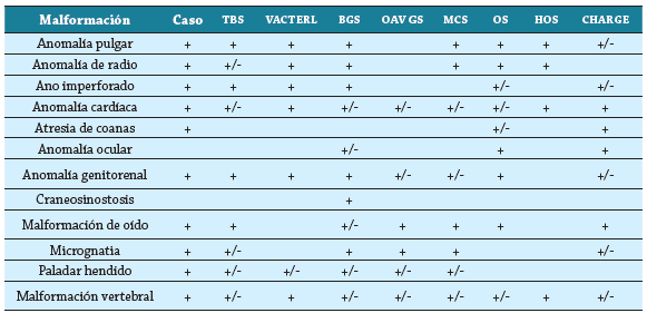 En tercer lugar se encuentra el Espectro Oculoauriculovertebral (OAV) o síndrome de Goldenhar (GS), caracterizado por hipoplasia malar, maxilar o mandibular, macrostomia, alteraciones auditivas, hemivértebras o hipoplasia vertebral, malformaciones del sistema nervioso central, cardiopatías y anomalías genitourinarias 44. Así mismo, existe el síndrome de Moeschler Clarren (MCS), el cual es la presencia de OAV o GS asociado a defectos radiales como hipoplasia o agenesia de pulgar y/o radio, cardiopatías, anomalías renales y del sistema nervioso central 45. Para diferenciar OAV o GS y MCS de TBS, se debe tener en cuenta que en las dos primeras el ano imperforado no se considera característica típica u ocasional, el cual sí fue evidenciado en nuestro caso.