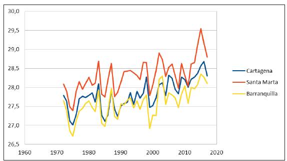 Entre 1972 y 2017 se observó un aumento de la temperatura media anual para las tres ciudades del estudio, y entre 2014 al 2016 se observó la temperatura media máxima; siendo la ciudad de Santa Marta la que registró las temperaturas más altas (figura 1).