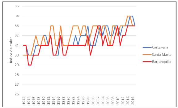 Entre 1972 y 2017 se observó un aumento del índice de calor anual para las tres ciudades del estudio, y en 2014 y 2015 Santa Marta presentó los índices más altos, con un valor de 34 (figura 2).