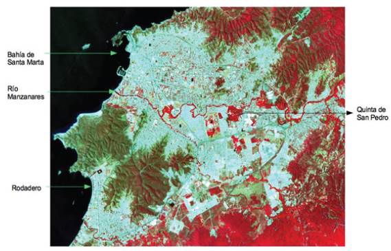 En la imagen satelital del Landsat 8 de Santa Marta se observó que existe una gran densidad poblacional con poca vegetación: la poca vegetación observada era solamente de un área de 2 kilómetros cuadrados, correspondientes a la Quinta de San Pedro.