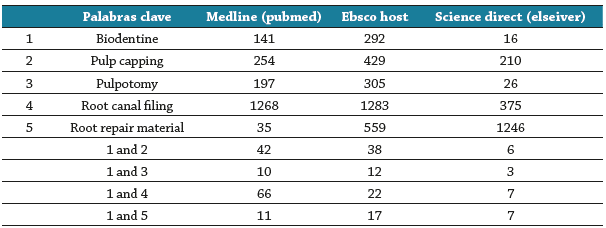Se realizó una búsqueda electrónica de literatura en las bases de datos Medline (Pubmed), EBS-CO-Host y Science direct (Elsevier) desde 2012 hasta la última semana de julio de 2020, utilizando como palabras clave Biodentine, Pulp capping, Pulpotomy, Root canal filing y Root repair material. Se encontraron artículos evidenciables, con alto niveles de verificación que clasificaron con el tema de estudio. Para refinar la búsqueda se tuvieron en cuenta estudios in vivo / in vitro, textos completos, textos en PDF, artículos en inglés y los conectores booleanos "AND y OR". No se utilizó restricciones por edad ni sexo. Se excluyeron revisiones narrativas, cartas al director, tesis, periódicos, conferencias, noticias, comentarios y editoriales. Finalmente, se procedió a realizar un tamizaje con aplicación de criterios a los artículos hallados en las bases de datos y se seleccionaron 168, de los cuales 46 cumplieron con los requisitos de inclusión, y posteriormente fueron analizados y discutidos (tabla 1).