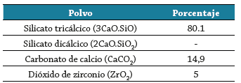La biodentine (Septodont, Saint Maur des Fossés, France) se encuentra disponible en forma de cápsula que contiene la proporción ideal polvo-liquido. El componente en polvo consiste en silicato tricálcico (3CaO.SiO), silicato dicálcico (2CaO.SiO2), carbonato de calcio (CaCO2), dióxido de Zirconio (ZrO2) y óxido de hierro. El silicato tricálcico, principal componente del polvo, y el silicato dicálcico son los componentes responsables de regular la reacción de fraguado. El carbonato de calcio es un material de relleno, en tanto que el óxido de zirconio le confiere el carácter de radio-pacidad a la biodentine. El componente líquido contiene cloruro de calcio (CaCl2), que actúa como un acelerador, al tiempo que un polímero hidrosoluble disminuye la viscosidad del cemento y permite reducir la cantidad de agua requerida en la mezcla y contribuyendo así a su fácil manipulación 7. Durante la mezcla, las partículas de silicato de calcio de la biodentine reaccionan con el agua a pH alto en una solución que contiene Ca2+, OH- e iones de silicato. El cemento tiene un tiempo de fraguado inicial superior a 6 minutos y un tiempo de fraguado final de 10-12 minutos. En comparación con los ionómero de vidrio y el MTA, la biodentine muestra una mejoría en el tiempo de fraguado gracias al aumento de tamaño de la partícula, la adición de cloruro de calcio como vehículo de la reacción y la disminución del contenido liquido 7. Camilleri et al. 8 en una investigación sobre la hidratación y bioactividad de la biodentine y el MTA constataron que el cemento no deshidratado de la biodentine corresponde a un silicato tricálcico, mientras que el MTA presenta un silicato monocálcico. Según los autores, la diferencia de composición en el cemento no deshidratado junto al tamaño del área de supericie de las partículas de silicato tricálcico en la Biodentine (2.811 m2/g) y del MTA (1,0335 m2/g) son factores fisicoquímicos determinantes que permiten una actividad biológica más importante de la biodentine en los tejidos dentales. La tabla 2 resume los componentes y su concentración en la biodentine.