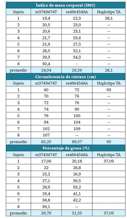 El sujeto con el haplotipo TA presentó obesidad según porcentaje de grasa con un puntaje mayor al promedio encontrado en el grupo con los alelos rs3749474T y rs4864548A, situándolo entre los 3 valores más altos (28.1 versus 24.04 y 26.56, respectivamente). Tanto en relación con el IMC y los centímetros de cintura el sujeto de estudio obtuvo un puntaje superior al promedio (tabla 1).