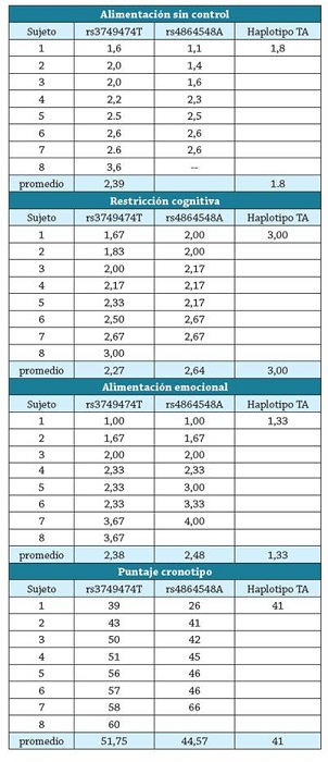 Por otro lado, el sujeto con el haplotipo TA presentó bajos puntajes en las dimensiones de alimentación sin control y alimentación emocional, quedando bajo el valor promedio comparado con los dos grupos de estudio; no obstante, su puntaje en cuanto a la restricción cognitiva fue la más alto al ser comparado con ambos grupos (3.00 versus 2.38 y 2.48, respectivamente) (tabla 2).