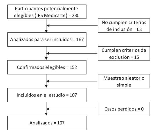 Muestra y muestreo: se estimó el tamaño de la muestra sobre una población de 230 personas con EM que pertenecían a la IPS especializada Medicarte en Medellín (Colombia), con un nivel de confianza del 95 %, un poder estadístico del 85 %, una correlación lineal esperada de 0,30 y un porcentaje de pérdida del 10 %, para un tamaño de 107 personas; se realizó muestreo aleatorio simple. En la figura 1 se presenta el flujograma de muestreo de los participantes.