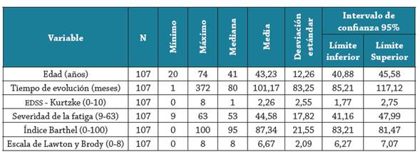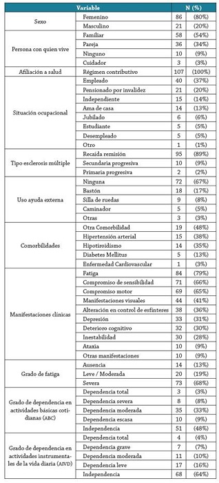 Participaron 107 personas con EM, principalmente del tipo recaída-remisión, la mayoría mujeres, con un tiempo promedio de evolución de 8,4 años y una edad media de diagnóstico de 35 años. Principalmente afiliados al régimen contributivo de salud, empleados o pensionados por invalidez y viviendo con un familiar. Las principales comorbilidades fueron la hipertensión arterial y el hipotiroidismo, en tanto las principales manifestaciones clínicas fueron, en su orden, la fatiga, compromiso motor y alteraciones de la sensibilidad, manifestaciones visuales y alteración en el control de esfínteres. El 33 % de los pacientes usaba alguna ayuda externa para su desplazamiento (tablas 1 y 2). La media de EDSS fue de 2,26 puntos, ubicando el 34 % de los participantes con examen neurológico normal y el 24 % con ninguna discapacidad o signos mínimos en los sistemas funcionales.