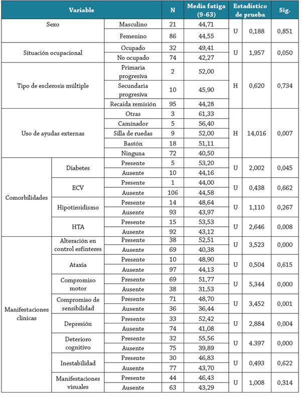 En el análisis exploratorio de la asociación de fatiga con las características sociodemográficas y clínicas se encontraron diferencias significativas en la percepción de fatiga respecto a uso de ayudas externas, comorbilidades como la diabetes e hipertensión arterial y manifestaciones clínicas como ataxia, alteraciones en el control de esfínteres, compromiso motor y sensitivo, depresión y deterioro cognitivo (p<0.05). Los grupos que usaban ayudas externas y presentaban estas comorbilidades y manifestaciones clínicas mostraron una media mayor de severidad de la fatiga (tabla 3). Se encontró diferencia marginal respecto a situación ocupacional; las personas ocupadas expresaron menor percepción de fatiga (p=0,05).