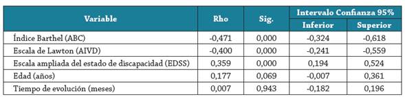 La severidad de la fatiga mostró correlación moderada, inversamente proporcional, con las ABVD y AIVD (p<0.001), lo cual significa que a mayor percepción de fatiga, menor independencia en las actividades funcionales de la vida diaria. No se encontró correlación significativa entre la fatiga con la edad y tiempo de evolución de la condición clínica (p>0.05) (tabla 4).