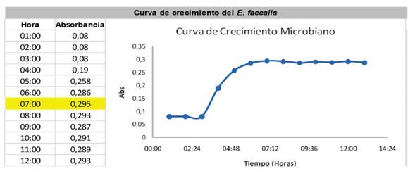 Estudio experimental in vitro. La muestra estuvo constituida por cepa de referencia de E. faecalis (ATCC 29212), la cual fue sembrada en una caja de Petri que contenía agar rico en nutrientes mediante la técnica de siembra por agotamiento y llevado a la incubadora durante 24 horas a 37°C para que creciera. Luego se tomaron de 5 a 10 muestras de colonias de las bacterias sembradas y con ayuda de un aza se inocularon en un tubo falcón, el cual contenían 100 |iL de caldo Mueller Hinton; se rotuló y se procedió a vibrar en un vórtex el falcón con el contenido del caldo inoculado; se depositaron las muestras en una placa de 96 pozos por triplicado para su posterior lectura en un lector MultiScan Ex (Thermo Sceintific) a una escala 0,08 - 0,1 ABS y una longitud de onda de 620 nm (macfarlán 0,5), para observar la curva de crecimiento del E. faecalis, tomándose lecturas cada hora; la primera se llamó hora cero, hasta alcanzar el máximo crecimiento de la bacteria y su posterior estado estacionario y deceso (gráfico 1)