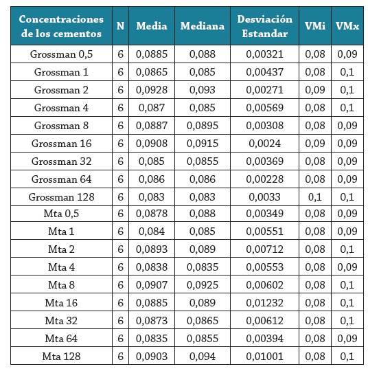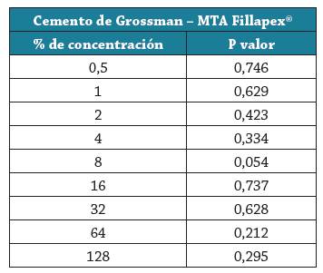 El análisis comparativo de los datos mostró que al comparar de dos en dos los cementos Grossman y MTA Fillapex® en las diferentes concentraciones por intermedio de la prueba de Mann-Whitney, ninguna de estas comparaciones resultó estadísticamente significativa (tabla 1).